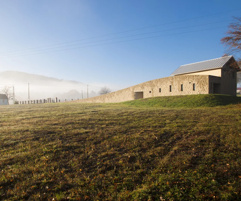 Bryła składa się z dwóch części, które odpowiednio wyrażają funkcję związane z przestrzeniami sacrum oraz profanum. Pierwsza odnosi się do miejsca modlitwy - kaplicy, która wyrazistą formą czytelnie komunikuje swoje przeznaczenie. Druga, zaś przykryta zielenią, wyrasta z ziemi po delikatnym łuku, skrywając pomieszczenia towarzyszące (m.in. chłodnie, pomieszczania techniczne czy sanitarne).