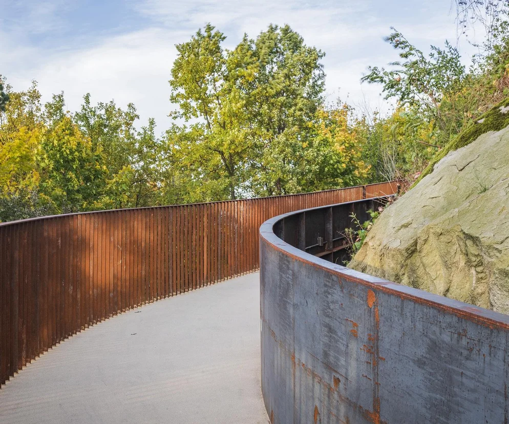 Dzięki zastosowaniu odpowiednich materiałów — kortenowskiej stali i betonu — oraz właściwej konstrukcji, kładka wpisuje się w krajobraz w sposób naturalny i nienarzucający się. Jej geometryczna prostota sprawia, że staje się integralną częścią otoczenia, a nie jedynie dodatkiem. Podążając nią, użytkownik doświadcza stopniowego przenikania się różnych warstw znaczeniowych: od naturalnych walorów przyrody, przez ślady przeszłości, aż po współczesne refleksje nad przestrzenią publiczną. W efekcie, realizując swoją podstawową funkcję komunikacyjną, kładka zyskuje również wymiar symboliczny — staje się pomostem nie tylko w sensie fizycznym, ale także kulturowym, estetycznym i środowiskowym. Harmonijnie wpisuje się w szlachetnie starzejącą się, wielowątkową kompozycję miejsca, wzbogacając je i jednocześnie respektując jego tożsamość.