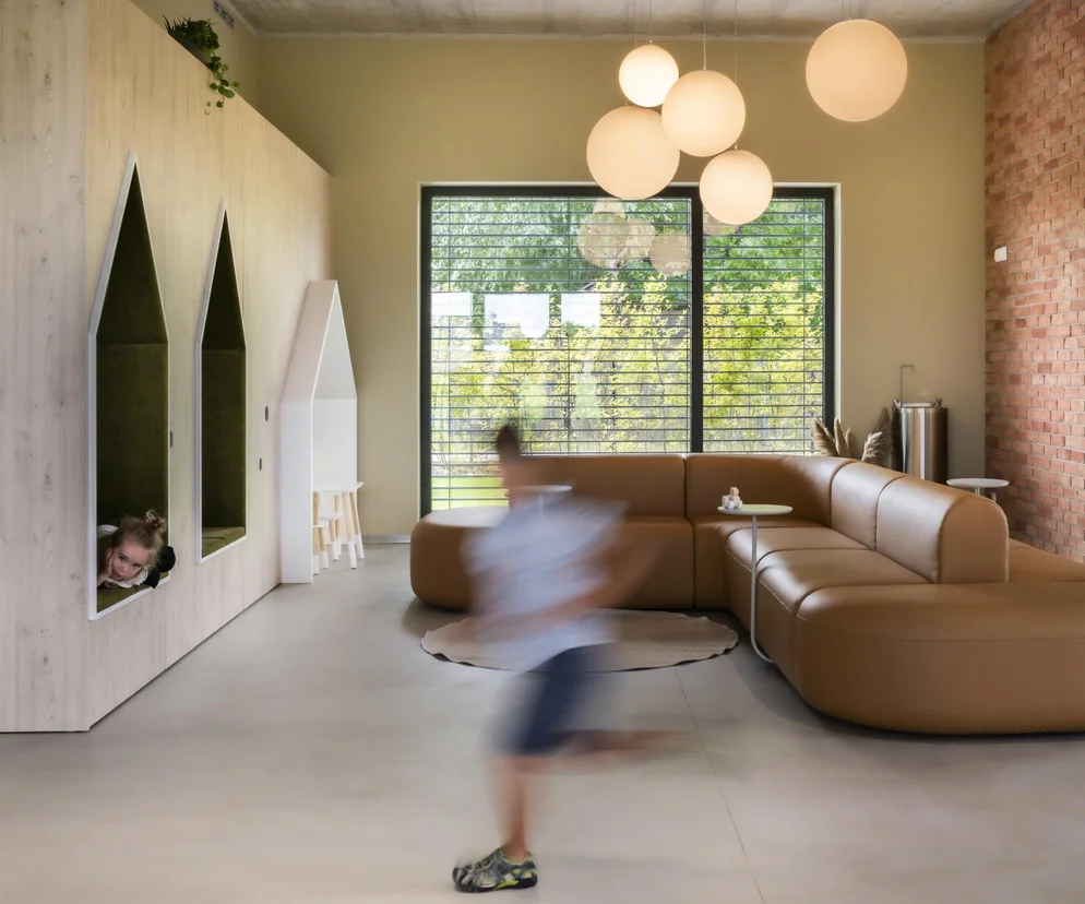 Zaproponowany przez nas układ funkcjonalny umożliwił realizację takich elementów jak np. pokój do karmienia niemowląt, łazienka z umywalką dostosowaną dla dzieci w wieku 3-6 lat czy rozbudowana strefa zabaw w poczekalni. Sporym wyzwaniem było umiejętne użycie koloru. Z jednej strony chcieliśmy go wpleść jak najwięcej i wiemy, że bardzo cieszy on użytkujące obecnie klinikę Maluchy. Z drugiej - przestrzeń miała też być komfortowa i ciekawa w odbiorze także dla dorosłych i bezpieczna dla dzieci o szczególnej wrażliwości na bodźce. Zdecydowaliśmy się na używanie kolorów pastelowych, bez krzykliwych akcentów oraz tło z materiałów o naturalnych, ponadczasowych barwach - cegły, jasnego drewna i betonu.