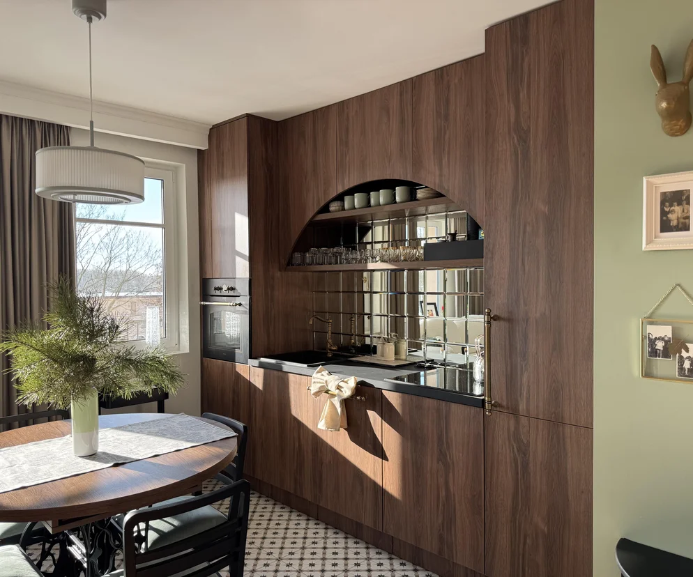Projekt prezentowanego mieszkania to historia minionych lat ze współczesnym design i tu stawiam kropkę. Wchodząc do mieszkania, widzisz otaczające cię bibeloty i pamiątki z lat międzywojennych, przenoszące w tamten okres. Za oknem rozbrzmiewa dźwięk dzwonów z sąsiadującego kościoła z charakterystycznymi kopułami, które stały się inspiracją do powstałego łuku w meblach kuchennych. To od tych kopuł wszystko się zaczęło.