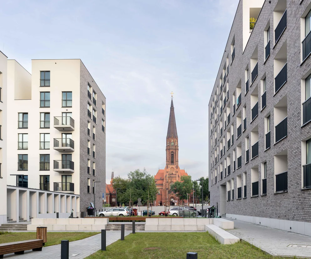 Umożliwiło to zachowanie otwartego, pozbawionego grodzeń, fragmentu miasta z placami i skwerami, które pozwalają na swobodne przemieszczanie się mieszkańcom osiedla i miasta oraz sprzyjają spotkaniom i rekreacji. Istotnym aspektem projektu było nawiązanie dialogu między nową zabudową a zastaną tkanką miejską. Dlatego architektura honoruje wysokości sąsiedniej zabudowy, wypełnia ubytki oraz spaja budynki nowe z zabytkowymi kamienicami. Miejscami, za sprawą ślepych, kurtynowych fragmentów elewacji materia zabliźnia tkankę i ożywia charakter elewacji.