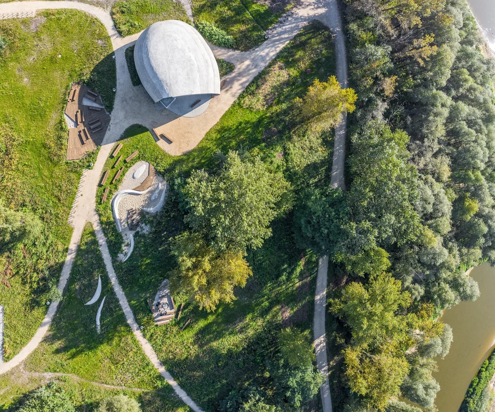 Forma pawilonu-kamienia łączy człowieka z naturą. Drobne okruchy tworzą zmienne ławice. Rzeka kreuje swój brzeg zgodnie z prawami natury, ma swoją własną geometrię, łach i ławic tworzonych przez przenoszony materiał skalny. Centrum opowieści o przyrodzie stanowi pawilon - kamień nawiązujący swym kształtem do kamieni polodowcowych charakterystycznych dla krajobrazu mazowieckiego środkowej Polski. Rysunek strefy brzegowej został przetworzony na plan łąki edukacyjno-przyrodniczej, która łączy się z sąsiednim rozległym obszarem brzegu rzeki objętym ochroną Natura 2000. Ścieżki przeplatają się z wyspami, które nawiązują do form aluwialnych, przyjmują ich kształt i odwołują się do materiałów transportowanych przez rzekę.
