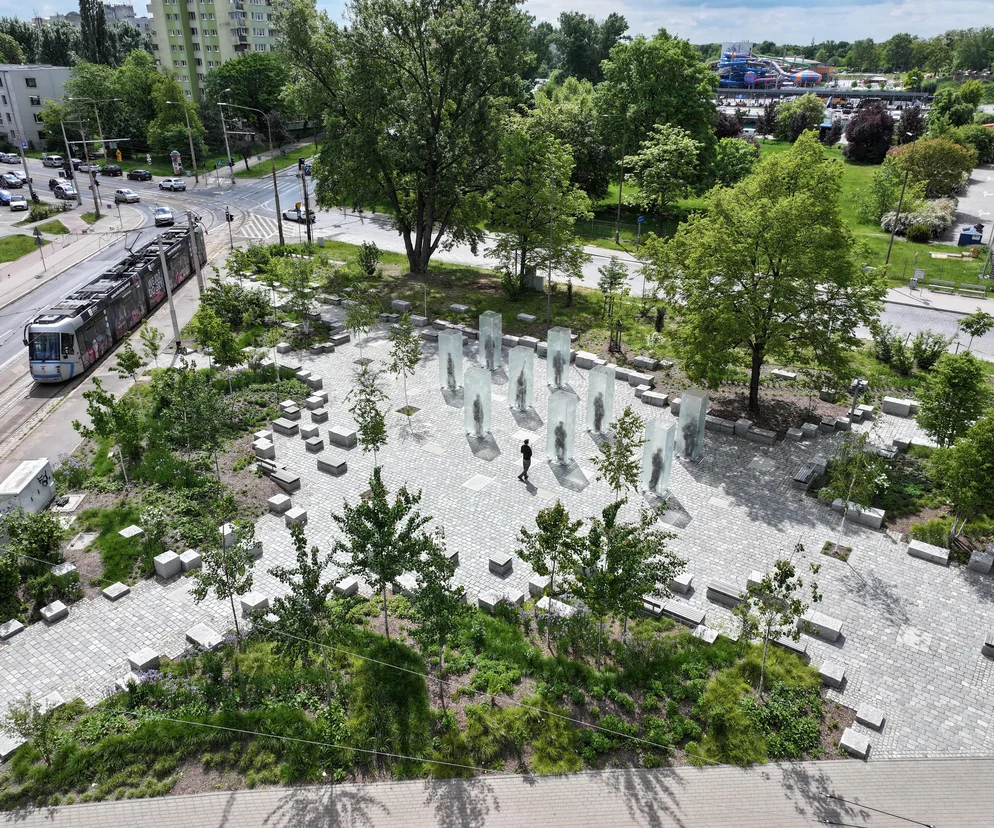 Pomnik wpisany jest w szerszą aranżację przestrzeni miejskiej – zieleń inspirowana polaną leśną, ławki, oświetlenie oraz bufor akustyczny sprawiają, że miejsce to staje się punktem wytchnienia, kontemplacji, ale i społecznym forum. Szklane formy są obecne także nocą, tworząc emocjonalny krajobraz świetlny. To projekt o znaczeniu artystycznym, edukacyjnym i tożsamościowym. Pokazuje, że architektura połączona ze sztuką może redefiniować zapomniane miejsca miasta, tworząc nowe centra znaczeń – przestrzenie, które poruszają i inspirują.