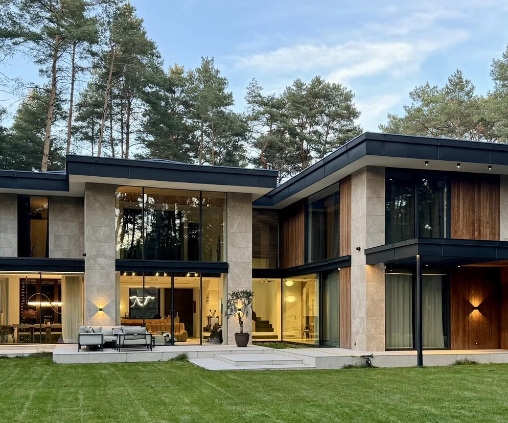 Projekt architektoniczny opiera się na prostych, geometrycznych formach oraz silnie zaakcentowanych horyzontalnych dachach stalowych, które nadają bryle horyzontalnych proporcji. Zamiast dominować nad krajobrazem, dom subtelnie wtapia się w leśną przestrzeń, dzięki zastosowaniu naturalnych materiałów – głównie jesionowego drewna i kamienia.