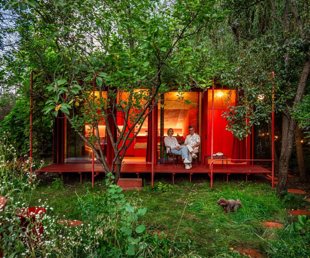 Ideą przewodnią było stworzenie współczesnej interpretacji kultury ogrodów działkowych, gdzie indywidualność właścicieli wyrażana jest poprzez kolor i formę. Projekt czerpie inspirację z wizualnego maksymalizmu inwestorów, tłumacząc ich artystyczną wrażliwość na język architektury. Dom celowo ukryty przed wzrokiem przechodniów, stopniowo wyłania się z zieleni. Od charakterystycznej czerwonej furtki z wizerunkiem psa prowadzi kręta ścieżka z czerwonych kamieni, oświetlona instalacją artystyczną. Bryła zwraca się plecami do wejścia, otwierając się wielkimi przeszkleniami na ogród i rozległy taras z 80-letnią pergolą winorośli. Kompaktowe wnętrze mieści przestrzeń dzienną z kuchnią, miejsce pracy dla obojga artystów, wnękę sypialną oraz łazienkę. Rozsuwane przeszklenia zacierają granicę między wnętrzem a ogrodem, umożliwiając przeniesienie pracy i wypoczynku na taras.
