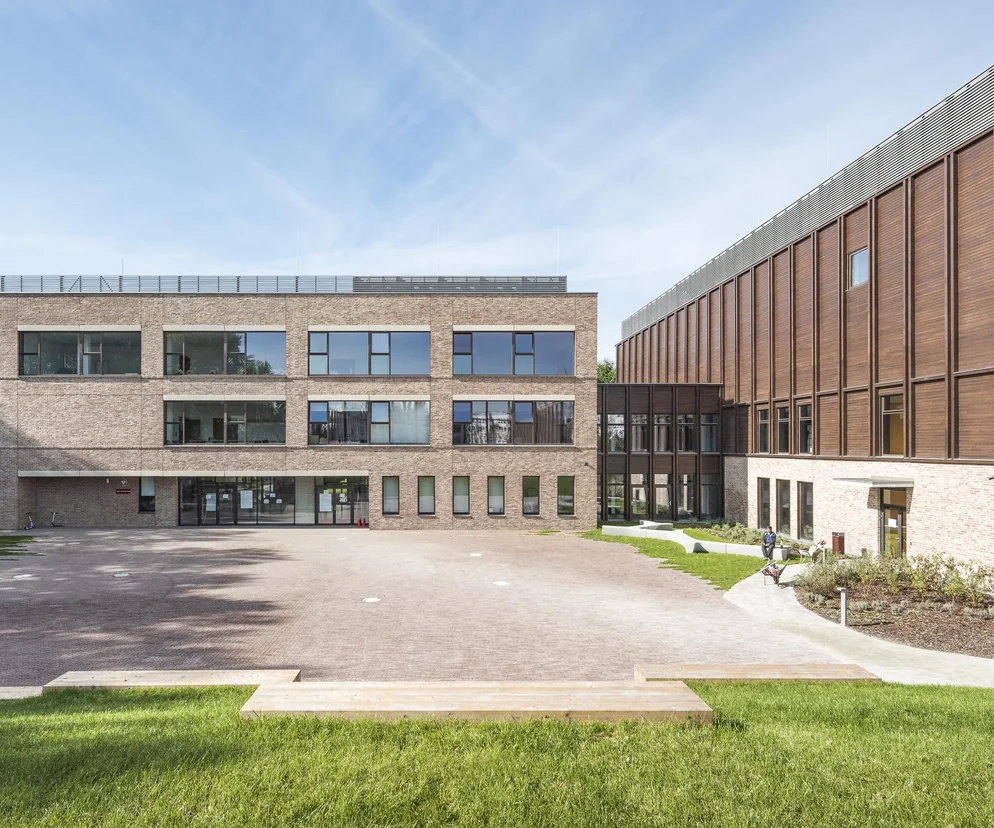 Centralnym punktem kompleksu jest ograniczony trzema budynkami brukowany plac wejściowy z zielonym amfiteatrem spływającym na plac z poziomu wyniesionej płyty boiska. Wszystkie budynki otoczone są terenami zielonymi o zróżnicowanej szacie roślinnej. Użytkownicy będą mieli do dyspozycji naturalne trawniki, łąki kwietne oraz tereny rekreacyjne, sportowe i wypoczynkowe przedzielone fragmentami wyższej roślinności i krzewami. Na całym obszarze założono nasadzenia drzew wysokich mających zachować różnorodność gatunkową.