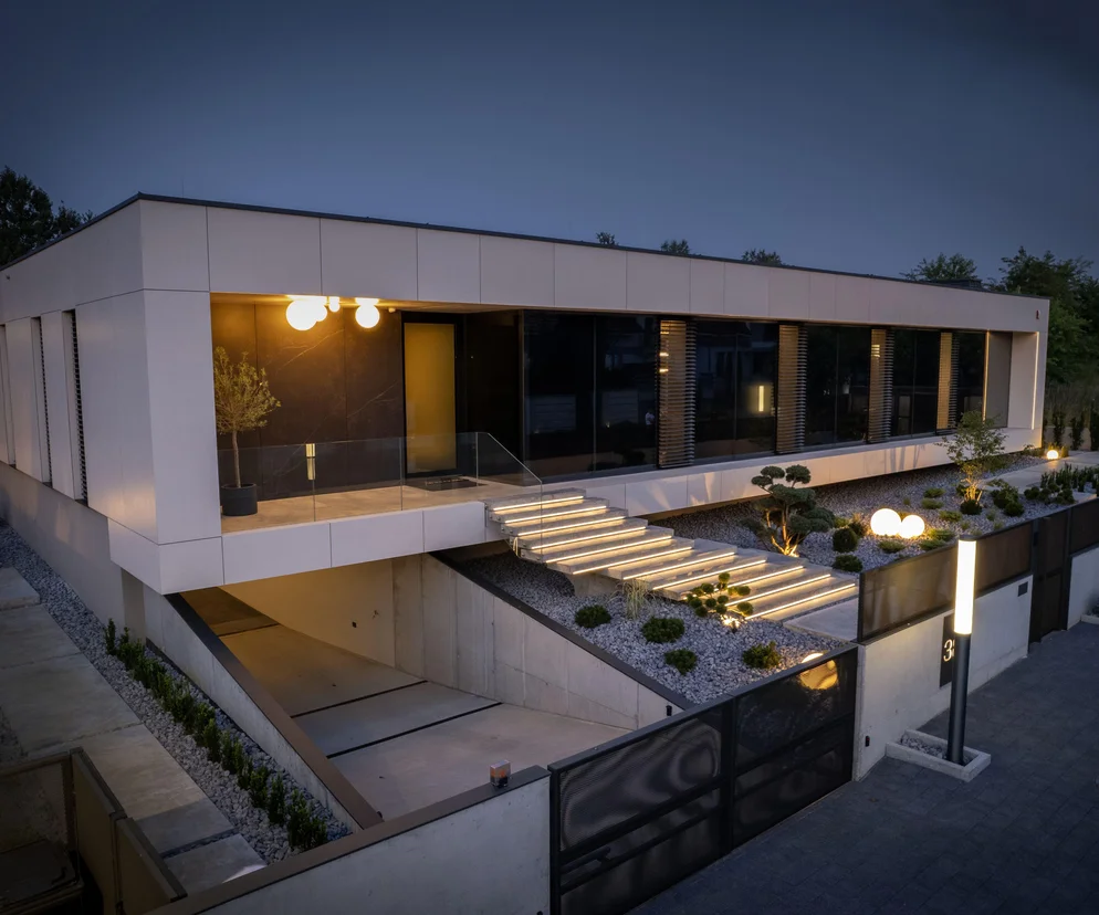 Z kolei strefa ogrodowa zamknięta jest w półpatio, które zapewnia spokój i osłonę od strony obu sąsiednich działek. Rozwiązanie z podziemnym garażem pozwoliło na optymalne wykorzystanie powierzchni zabudowy. Inwestor wracając do domu wjeżdża bezpośrednio do garażu w związku z tym, to właśnie podziemna kondygnacja jest faktyczną i niezwykle prywatną strefą wejściową