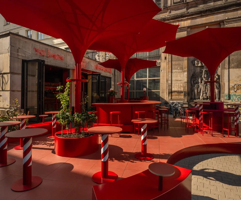Inspiracją były weneckie Giardini della Biennale – miejsce spotkań sztuki i życia. Projektując "Giardino", dążyliśmy do utworzenia mikrokosmosu, gdzie granice między architekturą a instalacją artystyczną się zacierają. Czerwone parasole o kielichowatych kształtach funkcjonują jak rzeźby-kwiaty wyrastające z ceramicznego pomostu, tworząc rozpoznawalny landmark w przestrzeni miasta.