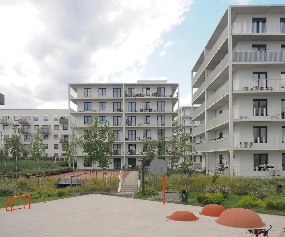 Z premedytacją wprojektowaliśmy w estetykę obiektu czynnik ludzki, zakładając już we wstępnych koncepcjach spontaniczną aranżację przestrzeni balkonowych – tu odniesieniem było doświadczenie oswajania bloków mieszkaniowych i luźne skojarzenia z inkrementalizmem Luciena Krolla. W przestrzeniach wspólnych w budynku wygospodarowano hojne dwukondygnacyjne kieszenie doświetlające wnętrze klatki schodowej. Na działce poza obrysem garażu podziemnego pozostawiono znaczną część terenu z gruntem rodzimym, co pozwoliło na nasadzenia zieleni wysokiej oraz na skuteczniejsza mikroretencję w terenie. Tereny rekreacyjne dla dzieci powiązano z podobnym terenem na przyległej działce.