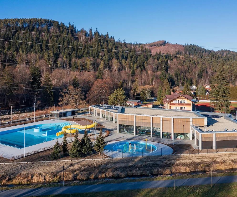 Część wellness obejmuje saunę fińską, łaźnię parową, komorę śnieżną, tepidarium oraz natryski wrażeń. Zewnętrzna strefa zawiera brodzik dla dzieci z atrakcjami wodnymi, główny basen rekreacyjno-pływacki z tarasem do ćwiczeń fitness oraz zjeżdżalnię ślimakową. Układ funkcjonalny zapewnia płynne skomunikowanie obu stref. Architektura obiektu, oparta na naturalnych materiałach, jak beton, drewno i szkło, nacechowana jest elementami architektury współczesnej, bazując jednocześnie na lokalnych materiałach i kulturowej spuściźnie regionu. Tektonika elewacji i jej rytm, w swoim zróżnicowaniu wysokości i kątów nawiązuje do krajobrazu regionu, do naszych gór i lasów.