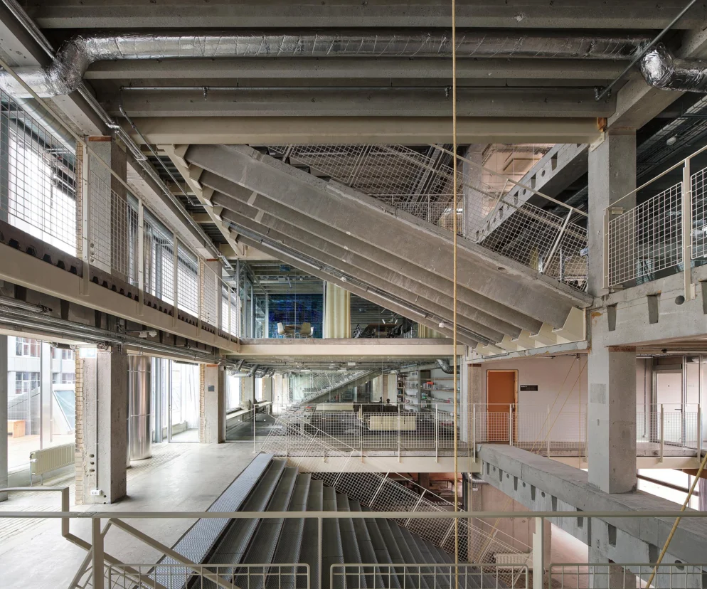 Najciekawsze jest to, że mimo tak istotnej ingerencji w funkcję i układ budynku, aż 95% zastanej substancji zostało ponownie użyte lub przetworzone. Betonowe stropy przecięto i pochylono, zamieniając w monumentalne schody i meble. Fragmenty elewacji posłużyły do stworzenia wybrukowanej przestrzeni przed frontowym wejściem. Odpady drewniane rozdrobniono i sprasowano w nowe płyty meblowe, które użyto przy wyposażaniu wnętrz. Nie wyrzucono nawet pozornie nieistotnych elementów – wszystkie trafiły do „magazynów materiałowych” w piwnicy, podzielonych na pule: drewno, gips, metal. Żadnego elementu betonowego nie wyrzuciliśmy na wysypisko – mówi Pihlmann. Chcieliśmy, by wszystko zostało tu, na miejscu. Nawet jeśli nie wiedzieliśmy jeszcze, jak to wykorzystać.