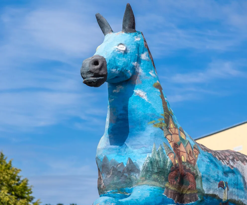 To być może najzabawniejszy pomnik, jaki polscy urzędnicy zgodzili się umieścić w przestrzeni publicznej. Koń z uniesioną przednią nogą i wytrzeszczonymi oczami, nieco przy kości, kojarzy się raczej z happeningiem niż czymś, co z dumą prezentuje się przed Miejskim Ośrodkiem Kultury i odsłania oficjalnie w 40-lecie uzyskania praw miejskich. A jednak – 5 września 2009 r. tak właśnie się stało. Rzeźba obchodzi więc w tym roku 16. urodziny.