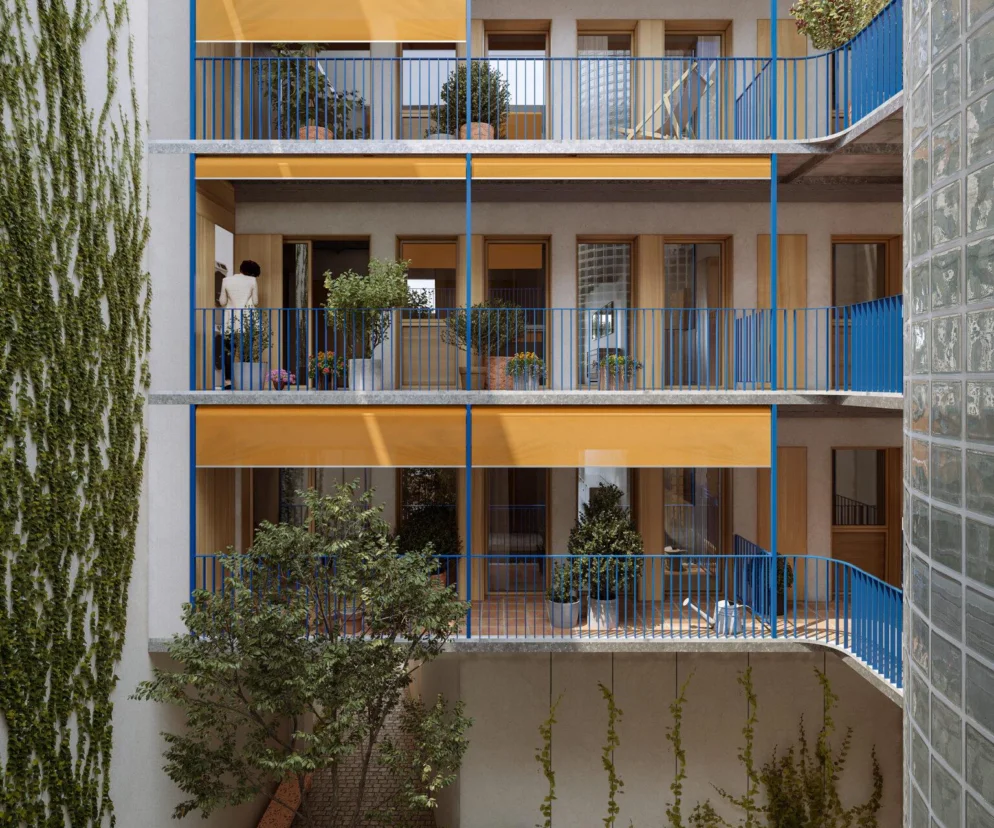 Zupełnie inny charakter ma wnętrze działki. Dziedziniec o powierzchni 74 m² oraz otaczające go elewacje zaprojektowano jako przestrzeń bardziej „domową” – ciepłą, miękką w odbiorze i nastawioną na codzienne użytkowanie. Wprowadzono tu naturalne materiały, galerie komunikacyjne i balkony, które pełnią funkcję stref pośrednich między mieszkaniem a przestrzenią wspólną. To właśnie tutaj pojawia się zasadnicza ambicja projektu: stworzenie warunków do życia wspólnotowego w bardzo ograniczonej przestrzeni. Uzupełnieniem przestrzeni wspólnych jest także dach – częściowo dostępny dla mieszkańców, częściowo pokryty zielenią.