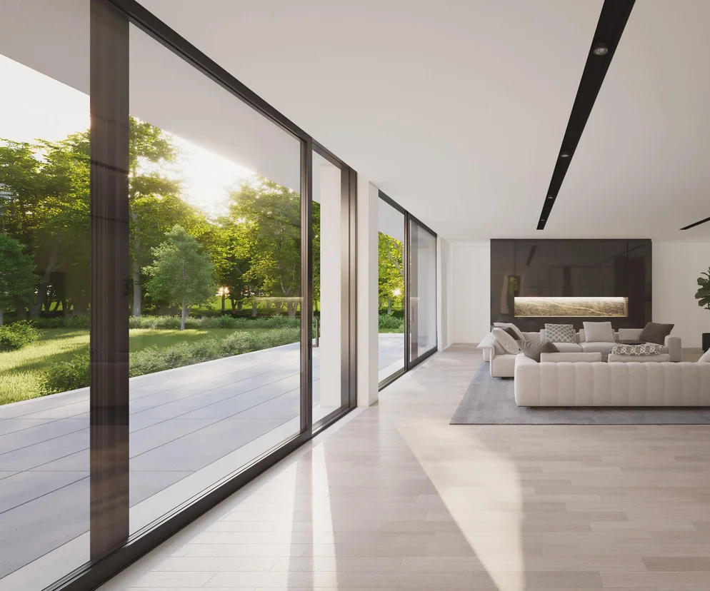 Szczególnie dużą rolę odgrywają tutaj rozwiązania pozwalające zminimalizować fizyczną obecność konstrukcji. Wąskie profile, ukryte skrzydła i zerowe progi sprawiają, że architektura zyskuje lekkość, a technologia nie konkuruje z otoczeniem – przeciwnie, pozwala się w nie wtopić. Panoramiczne drzwi przesuwne dają możliwość otwarcia ściany, rozszerzając salon na taras, a jadalnię zamieniając w ogrodową przestrzeń. Wielkoformatowe przeszklenia – zwłaszcza narożne lub wielokondygnacyjne – nadają aranżacji efekt teatralny: codzienne życie toczy się na tle zmieniającego się pejzażu. Wrażenie płynności i ciągłości przestrzeni dodatkowo wzmacnia wybór szkła o wysokiej jakości, które nie zniekształca kolorów ani konturów. W dobrze zaprojektowanym układzie architektonicznym przeszklenia przestają być barierą – stają się portalem do natury.