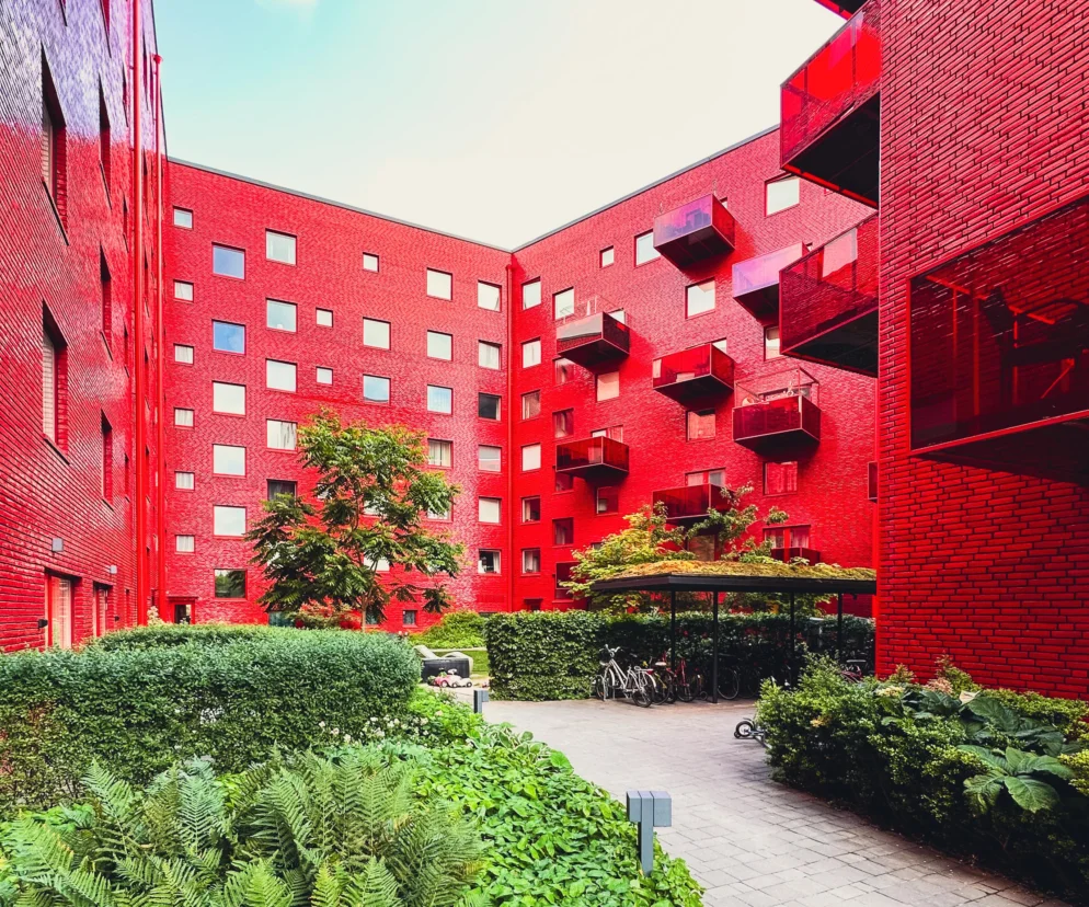 Pierwsze wrażenia? Nie ma co dywagować. Kolor przesłonił mi wszystko. Intensywna czerwień to jedno. Ale że płynęła ze szkliwionej cegły, która była dosłownie wszędzie to drugie. Ileż to musiało kosztować? Komuś musiało naprawdę na tym zależeć. I rzeczywiście zależało. Za projektem stała uznana szwedzka pracownia Wingårdhs. Za całość odpowiadał sam jej założyciel, Gert Wingård. To on się uparł, by ten siedmiopiętrowy budynek z około setką mieszkań, parkingiem podziemnym i lokalami usługowymi na parterze wykończyć tak luksusowo. Intensywny, czerwono-karmazynowy odcień został specjalnie opracowany na potrzeby tego projektu (i opatentowany).