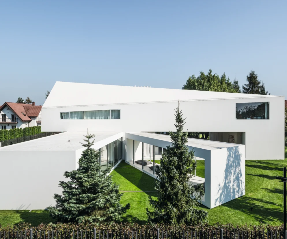 W okolicy zabudowanej typowymi, przeważnie dwukondygnacyjnymi domami rodzinnymi świeci swoją wyjątkową bielą dachu i elewacji Dom Kwadrantowy autorstwa Roberta Koniecznego. Choć gabarytami nie odstaje od sąsiednich obiektów i wpisuje się w charakter tutejszej zabudowy, to już przy pierwszym spojrzeniu wyróżnia się znacząco nie tylko kolorem, ale całą koncepcją.
