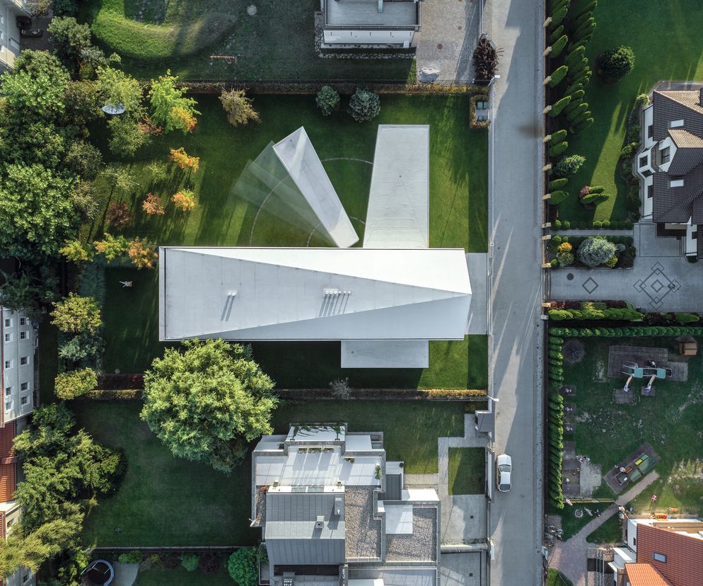 The clients dreamt of a house that would have a simple yet unique form, and would catch as much sun as it is only possible in our climate. They particularly wanted to have a spacious, sunlit area. Robert Konieczny invented an innovative system for the regulation of the amount of sunlight in the first floor living space by designing a movable terrace. He was inspired by the form of a quadrant, an instrument formerly used for measuring the position of stars. The terrace moves on a rail running one-fourth of a circle between two wings of the house, one containing the living area with a kitchen, the other, a home spa. In this way it regulates the amount of daylight penetrating inside, opening the wings to the sun or providing shade. The propulsion is fully automatic, furnished with safety sensors. Apart from the terrace, the house has a form of a cross with uneven arms, created by “cutting out” and turning a part of the first floor so as to screen the interior of the plot from the road. The local masterplan required a pitched roof, the clients wanted a flat one, so Konieczny combined the two requirements to create an unusual mass.