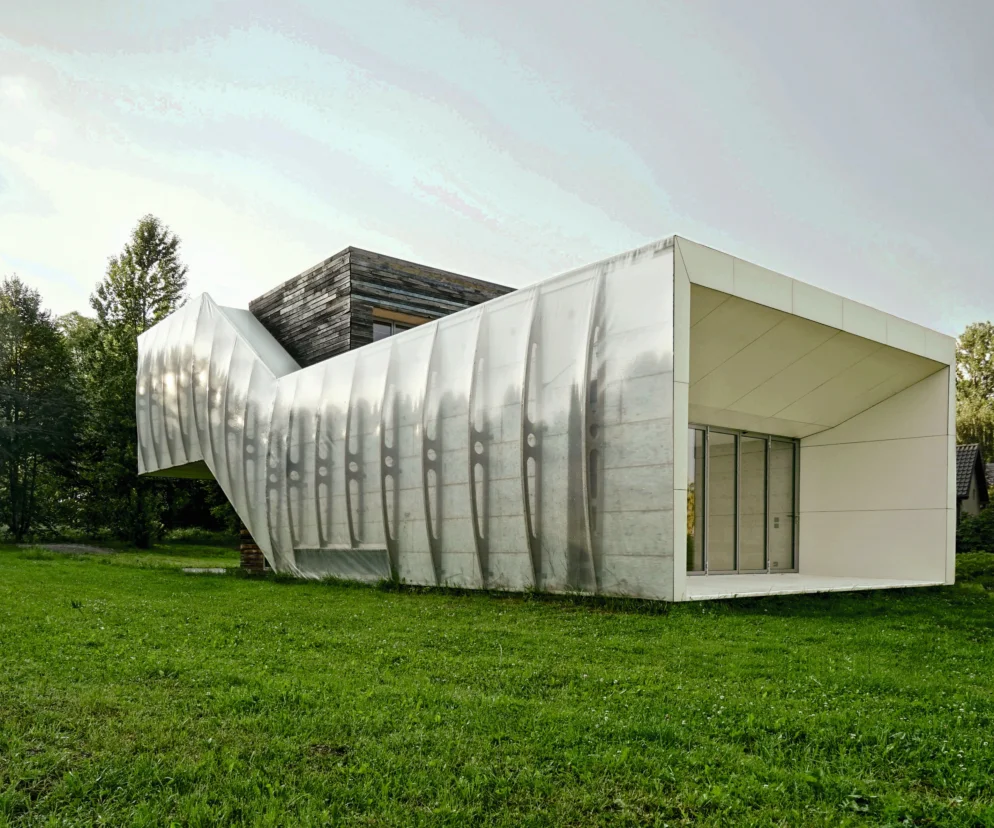 Trochę zaskakujące były informacje o usytuowaniu, bo na zdjęciach i wizualizacjach nigdzie sąsiadów nie widać. W publikacjach i na stronie dom prezentowany jest jako biała „gąsienica” na wielkim trawniku lub nad jeziorem.