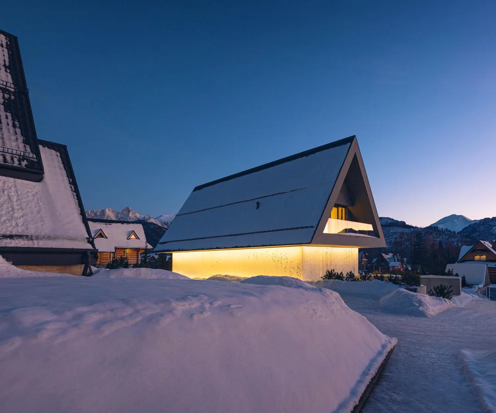 Bryła nawiązuje do formy szałasu. Elewację ukształtowano w oparciu o ruchome, ażurowe panele wykonane we współpracy z marką Equitone. Panele kontrolują dopływ światła, tworzą zróżnicowaną fakturę i kolorystykę elewacji oraz pełnią funkcję zewnętrznego ogrodzenia. Mogą być zamykane lub otwierane automatycznie, umożliwiając zmianę stopnia odsłonięcia domu. Materiał elewacyjny i schemat perforacji odnoszą się do skojarzeń z ośnieżonymi szczytami Tatr i lokalnymi ornamentami. Dach pokryto blachą tytanowo-cynkową ZM Silesia. Po zmroku dzięki ukrytej iluminacji dom emituje światło na zewnątrz, ponieważ oświetlenie umieszczono bezpośrednio w strukturze podcienia.
