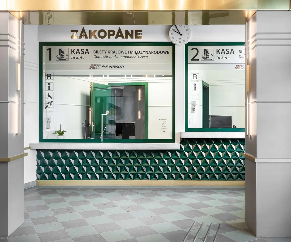 Zakopane, the main city of the Polish Tatras and a ski resort, has been the destination of crowds of tourists, winter sports fans and holidaymakers for over a century. For decades, the easiest way to reach it was by train, until cars and buses took precedence, making the railroad traffic and the train station somewhat obsolete. Recently it was decided, however, to create a comprehensive transportation hub there: a bus terminal and a multi-level parking are now under construction, while the neo-Classical building of the train station and especially its Art-Deco interiors required in-depth renovation conducted according to conservation guidelines. The original walls in the entrance zone were reintroduced, original timber elements uncovered in stairwells were preserved, and remains of the original bottle green varnish on windowsills influenced the choice of the color scheme: green tiles on walls and counters, white walls, wooden and brass details. Also, the divisions of the original windows were continued in the rhythm of horizontal laths and facings.
