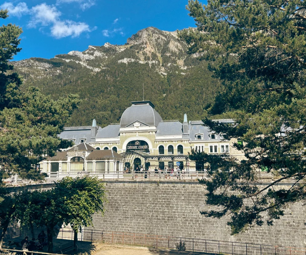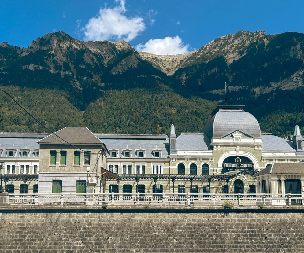 Canfranc Estación odznacza się na tle surowej panoramy Pirenejów