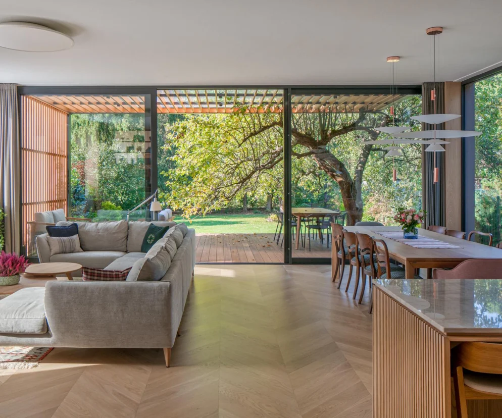 Przedłużeniem przeszklonej części dziennej jest zadaszony taras, który zamyka wspomnianą jabłoń w przestrzenne ramy.