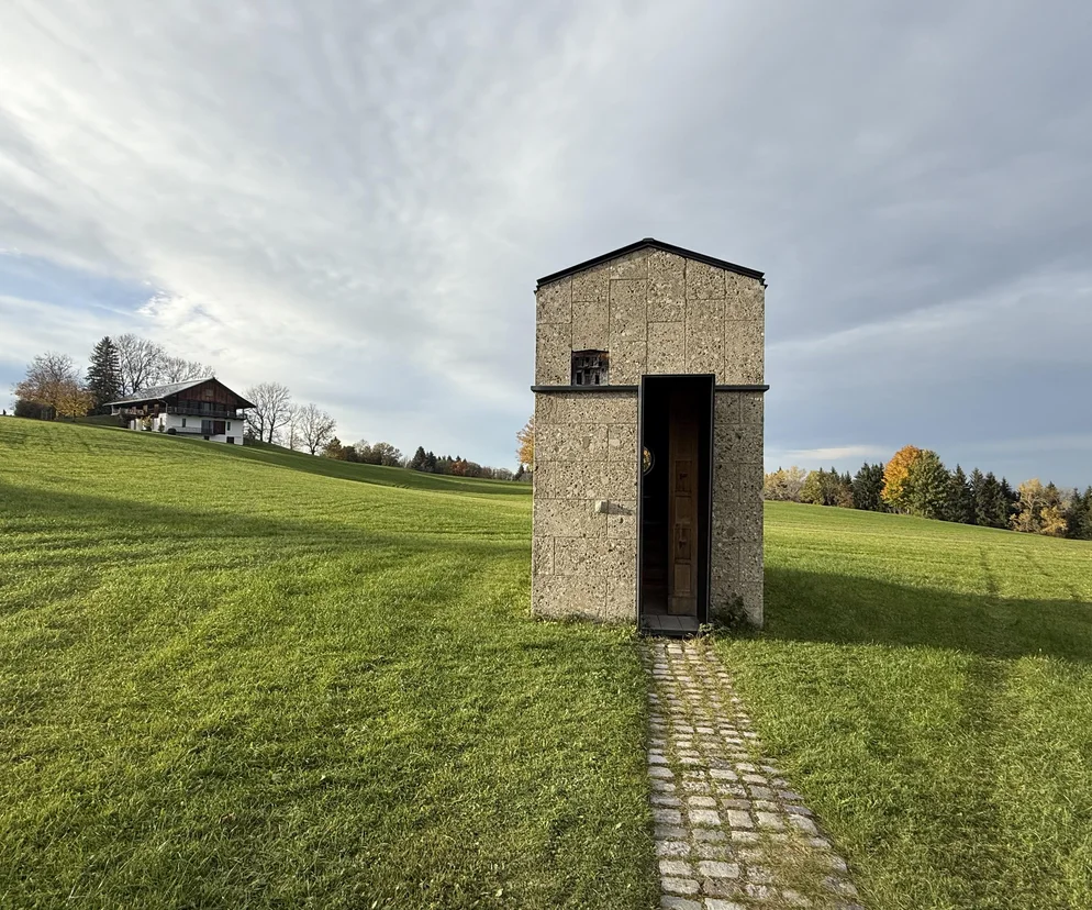 Łąka, na której stoi, jest nie do odnalezienia bez pomocy mieszkańców Schliersee, czy Bayrischzell w Alpach Bawarskich, pomiędzy którymi włoski architekt zaprojektował obiekt, w skrajnie minimalistyczny sposób opisujący architekturę sakralną. Głęboko w górach, z daleka od czegokolwiek i kogokolwiek. W sąsiedztwie tylko pojedyncze gospodarstwa i alpejskie kaprysy pogody. Prawdopodobnie takiego kontekstu poszukiwał architekt.