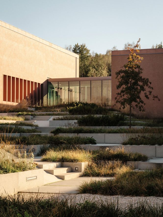 Obiekt opiera się o ścianę lasu, całość spaja ciepła kolorystyka