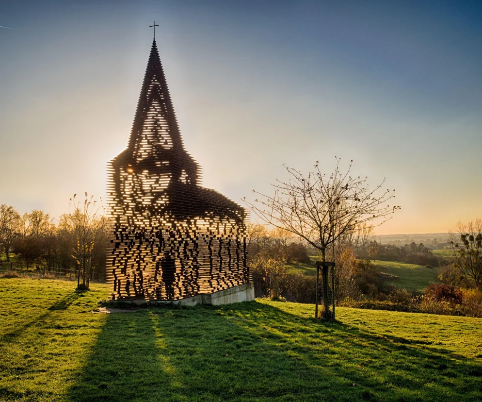Całość spoczywa na żelbetowej płycie fundamentowej. Z daleka budowla jawi się jako niemal całkowicie przezroczysta, mirażowa; z bliska i pod odpowiednim kątem materializuje się w pełni – ujawniając ostro zarysowane otwory okienne, sklepienie i iglicę wieży. W miejscach okien płyty są zwężone, co wzmacnia penetrację światła i pogłębia efekt dynamicznej gry cieni. Proces projektowy obejmował skanowanie laserowe istniejącego kościoła wzorcowego, sporządzenie 100 precyzyjnych rysunków planów dla belgijskiego wykonawcy Cravero, cięcie laserowe elementów w warsztacie (33 tony stali pocięto w tydzień), spawanie sekcji oraz montaż dźwigowy na placu budowy w zaledwie jeden dzień. Konstrukcja nie pełni funkcji sakralnej ani użytkowej – jest autonomiczną rzeźbą-architekturą, której doświadczenie zależy w pełni od ruchu widza i zmiany perspektywy