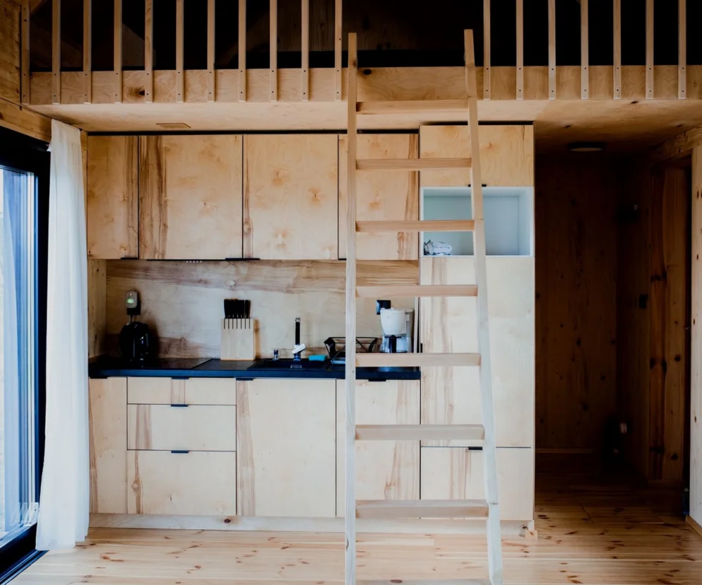 W środku, na 26 metrach kwadratowych, udało się rozplanować otwarty salon z kominkiem oraz aneksem kuchennym, za którym znajduje się wydzielona łazienka. Sypialnia zlokalizowana została na niewielkiej antresoli.