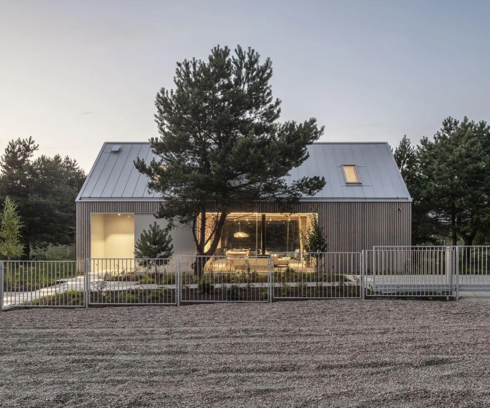 Elewacja działa w dwóch porządkach materiałowych. Opalane drewno modrzewiowe wnosi fakturę i unaocznia zmienność materiału w czasie, aluminium odpowiada za refleksyjność i lekkość optyczną. Przy tak ograniczonych środkach ciężar architektury przenosi się na detal, który staje się głównym nośnikiem wyrazu i spina całość w spójny, kontrolowany system.