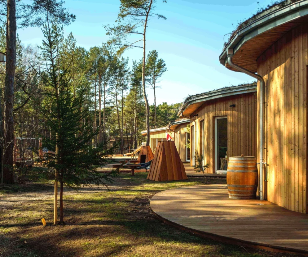Zewnętrze obiektu to trzy strefy zaprojektowane przez Katarzynę Kwiatkowską, które pełnią funkcję dydaktyczną. Znajdziemy tu leśny ogród z naturalnymi konstrukcjami, część edukacyjną z hotelem dla owadów i ogrodem warzywnym oraz sferę sensoryczną ze ścieżką wyciszenia. Ściany korytarzy zdobią pnie brzozy i rysunki owadów, co sprawia, że dzieci czują się jak na obozie skautów.