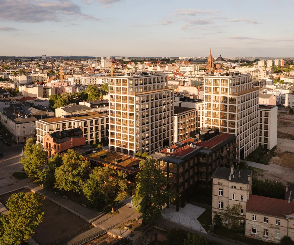 Przy tak atrakcyjnej lokalizacji nie dziwią ambicje dewelopera, żeby budować wysoko i gęsto. Architekci z BBGK – dzięki zaprojektowaniu spójnej kompozycji urbanistycznej, respektującej istniejącą zabudowę historyczną – sprawili, że zespół jest także dobrze wpasowany w otaczającą strukturę miasta. W efekcie powstała zabudowa w strukturze kwartałowej, której główne fronty zostały powiązane z siatką ulic Obrońców Bydgoszczy i Marcinkowskiego. Wysokość nowej zabudowy lokalizowanej po obwodzie dostosowano do istniejących w otoczeniu trzy- i czterokondygnacyjnych kamienic. Dzięki takiemu zabiegowi ulica Obrońców Bydgoszczy uzyskała spójność, także pod względem charakteru. Intensywność i wysokość zabudowy znacząco rośnie we wnętrzu kwartału, gdzie zlokalizowano dodatkowo jedenastokondygnacyjne obiekty.