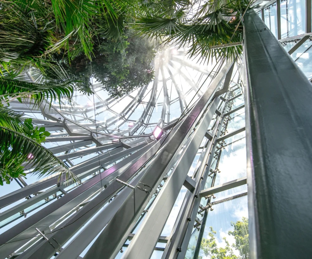 Szklana elewacja rotundy została zbudowana z 420 szyb o różnych wymiarach, z których każdą przymocowano za pomocą stalowych rotuli – montaż wymagał więc ogromnej precyzji. Szklany dach wyposażono w automatycznie otwierane wywietrzniki, a w budynku zamontowano system sterowania klimatem, aby rośliny tropikalne rosły w warunkach odpowiadających ich naturalnemu środowisku.