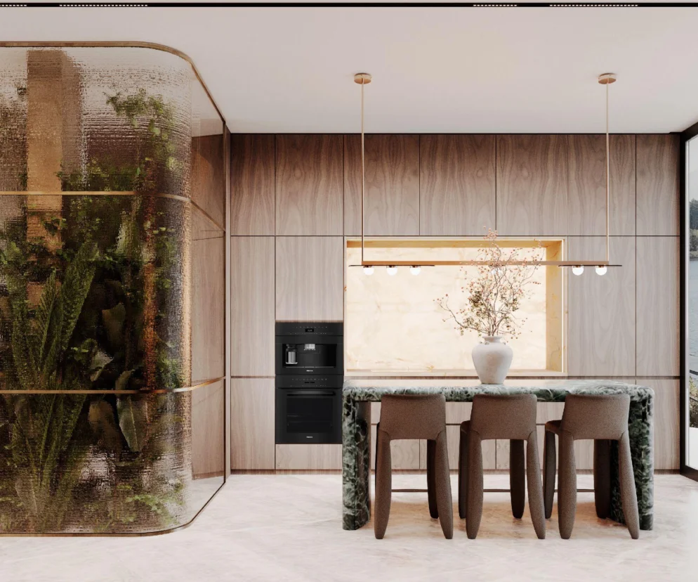 Jednym z najbardziej charakterystycznych elementów wnętrza jest zielona enklawa zamknięta w zaokrąglonej ścianie ze szkła katedralnego. Ornamentowa faktura szkła lekko rozmywa kontury roślin, nadając im niemal malarski charakter. To bardziej fragment krajobrazu przeniesiony do środka niż klasyczna dekoracja – szczególnie, że za szkłem skrywa się łazienka. Motyw zieleni powraca także w sypialni głównej, gdzie pionowa płaszczyzna zielonego marmuru za łóżkiem subtelnie nawiązuje do barwy jeziora, budując spokojną, wyciszoną atmosferę.