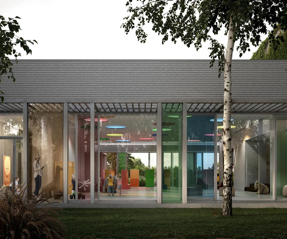 Budynek projektu 77Studio architektury, powstający niedaleko Warszawy, w założeniu ma wpisać się w otaczającą zieleń i stworzyć pobudzające wyobraźnię miejsce dla najmłodszych. Projekt zakłada budowę pięciooddziałowego przedszkola w formie parterowego, rozłożystego pawilonu. W części obiektu zaplanowano dodatkową kondygnację o zielonym charakterze.