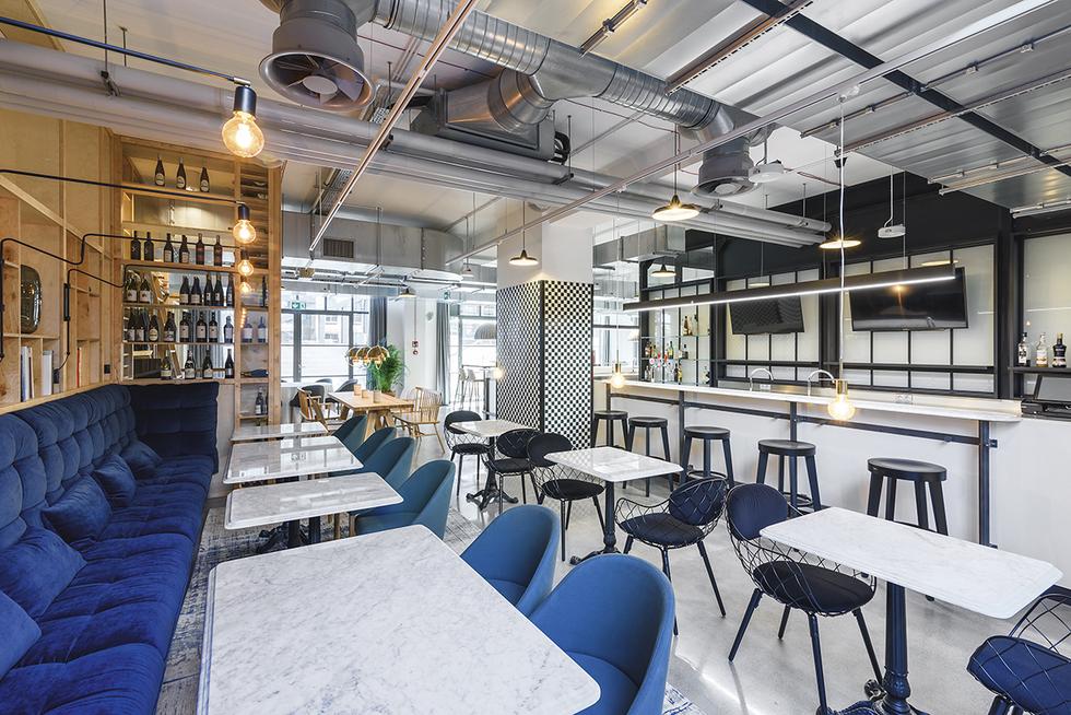 Ściany części kuchennej i barowej wyłożono płytkami ceramicznymi, nawiązującymi do wykończenia głównej klatki schodowej Concordii. Pozostałością z czasów drukarni są otwory okienne sięgające od podłogi po sufit, z tą różnicą, że dawniej zamknięte w studniach jedynie doświetlały i wentylowały wnętrze, a dziś pozwalają na swobodną komunikację z placem, zarówno fizyczną, jak i wzrokową. Hasło przewodnie restauracji „jedz jak lubisz” projektanci potraktowali dosłownie. Odwiedzający mają więc do wyboru przeróżne kanapy, fotele, całą gamę krzeseł, wysokie stołki barowe, a nawet dębowe pieńki rozmieszczone w poszczególnych strefach. Jak na centrum designu przystało, znawcy tematu odnajdą tu projekty znanych polskich i światowych marek takich jak fotele Krystyna Kowalskiego, krzesła Magis czy lampy Hay. Pomimo różnorodności stylów wnętrze tworzy spójną, a jednocześnie elastyczną całość. Pozwala też na łatwą zmianę aranżacji, bo niemal wszystkie elementy są ruchome – lampy można przesuwać na szynach, szafki mają zamontowane kółka. Wejścia prowadzące bezpośrednio z Przystani, jak i z wyższych kondygnacji budynku znajdują się w środkowej części lokalu i dzielą go na dwie zasadnicze części – nieformalną oraz oficjalną. Charakter tej pierwszej nadają białe zwiewne, półprzezroczyste zasłony wydzielające kameralne wnętrza. W jednym z nich oprócz stołów znajdują się drewniane podesty, które wykorzystać można jako miniwidownię lub namiastkę placu zabaw dla dzieci. Całość uzupełniają rośliny umieszczone na specjalnych regałach i podwieszone pod lampami w niewielkich doniczkach. W drugiej strefie, bardziej eleganckiej, dominuje obramowana na czarno witryna otwartej kuchni i długi blat baru. Wyrazistym elementem są również ceramiczne szachownice na części ścian oraz przeszklona „piwniczka” na wino, z butelkami wyeksponowanymi na drewnianych półkach, które wystają również poza przeszklenie i zajmują całą szerokość jednej ze ścian. Surowość betonowych posadzek złagodzono kilkoma dywanami, zasłonami okien w tylnej części sali oraz tekstylnymi obiciami wybranych siedzisk. Gustownie, choć z przymrużeniem oka, potraktowane zostały toalety – różowe dla pań, niebieskie dla panów i zielone dla niepełnosprawnych, w których prócz posadzek z czarnych, białych i szarych heksagonalnych płytek uwagę zwracają baterie w kształcie metalowych wróbelków.