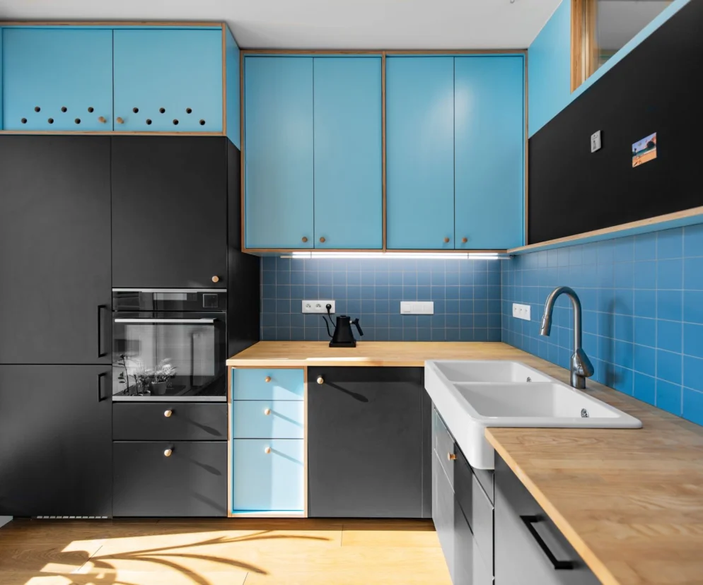 Wykończenie wnętrza w dużej mierze charakteryzuje użycie różnych odcieni niebieskiego – ulubionego koloru inwestorów. Projektowana zabudowa została wykonana z laminowanej sklejki brzozowej pokrytej dwustronnie HPL-em w odcieniu błękitnym oraz płyty MDF lakierowanej na granatowo. Posadzkę wykończono szczotkowanym drewnem dębowym, a w łazience użyto płytek ceramicznych barwionych w masie.