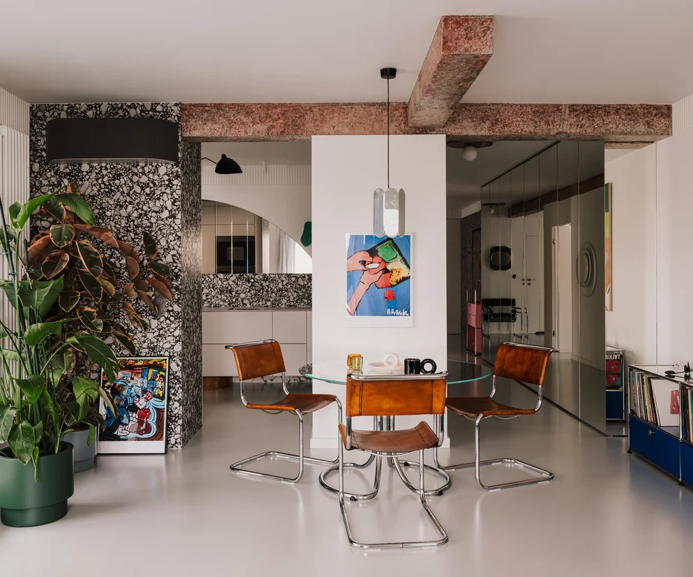 Wyjątkowego zestawu, jaki mają w domu, nie powstydziłoby się muzeum dizajnu. Meble kupili w showroomie Nostalgia, prowadzonym przez kolekcjonerkę Aleksandrę Schmidt, znawczynię Bauhausu i stylu mid century modern. W swoim imponującym zbiorze właściciele apartamentu mają m.in. krzesło O-line zaprojektowane w 1982 roku przez Herberta Ohla dla marki Wilkhahn; słynne krzesło Tulip Eero Saarinena, projekt z 1956 roku stworzony dla Vitry; stół autorstwa Gastone’a Rinaldiego, wytwór założonej w 1916 roku firmy Rima zajmującej się produkcją mebli metalowych.