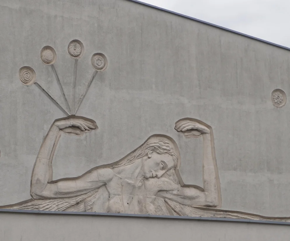 - Na froncie Filharmonii widzimy nagą kobietę w ekstatycznej pozie, przywodzącą na myśl starożytne wieszczki, uwiecznione na greckich wazach i mozaikach. Obok niej widzimy organiczne kształty kojarzące się z muszlami i subtelne linie, zapraszające nas do chłonięcia całym sobą nieskończonego, ponadczasowego piękna muzyki, ale też przyrody, w którą możemy zanurzyć się w sąsiadującym z filharmonią Parku Zwierzynieckim.