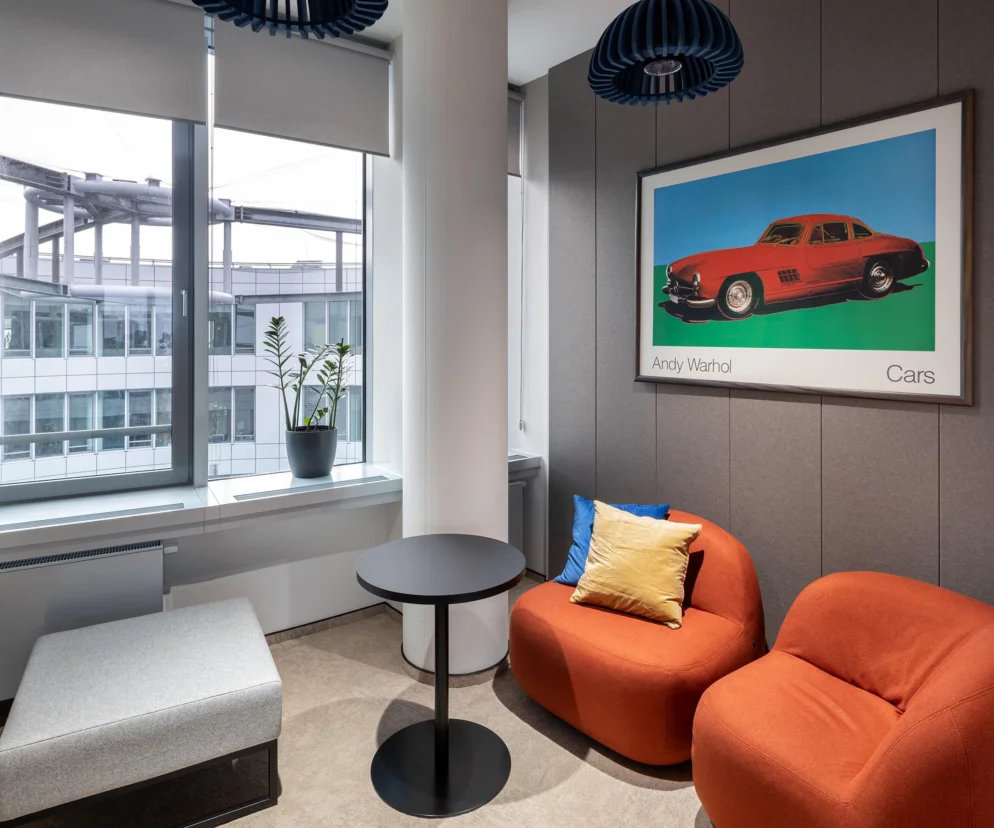 – Pomimo że ogólny projekt odchodzi od dosłownych nawiązań, zastosowaliśmy wiele indywidualnych elementów bliskim marce Mercedes Benz, jak np. sale dedykowane modelom AMG i Maybach czy recepcja, której lada nawiązuje do rozwiązań stosowanych w salonach samochodowych. Co więcej, ze względu na liczne sukcesy marki w motosporcie, wspólnie z Klientem stworzyliśmy nowy system oznakowania, inspirowany wyścigami Formuły 1. Sale konferencyjne otrzymały nazwy takie jak Monza, Monaco czy Las Vegas, a na ich drzwiach pojawiły się grafiki z kształtami torów. To subtelne, ale czytelne nawiązanie do świata motoryzacji i sportów wyścigowych, a jednocześnie funkcjonalny element, ułatwiający orientację w przestrzeni – mówi Sylwia Drążkiewicz-Kuczyńska, Tétris.