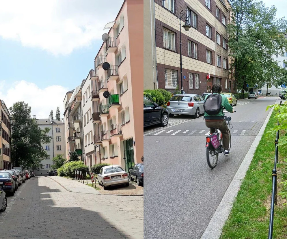 Co i jak tu robimy, zostało uzgodnione z mieszkańcami podczas konsultacji projektu przebudowy. Zniknęła trylinka, ulica stała się strefą zamieszkania, gdzie piesi mają pierwszeństwo, jest ograniczenie prędkości do 20 km/h. No i oczywiście duma i zasługa mieszkańców - zieleń!