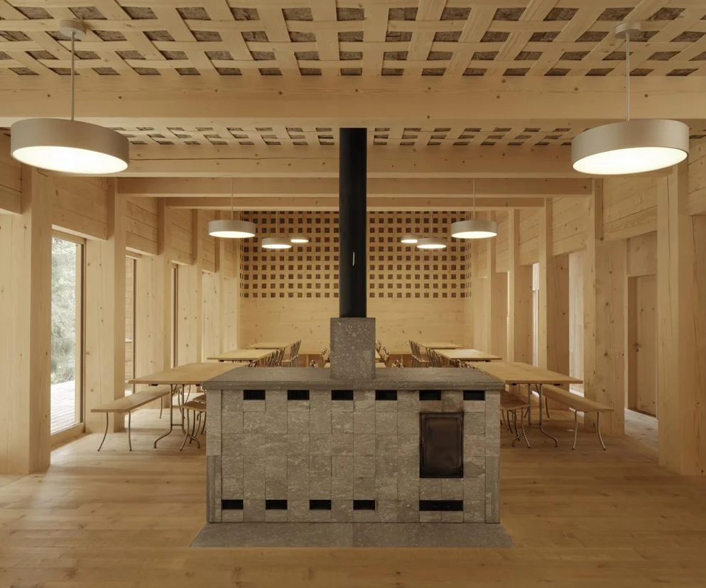 Architekt zdecydował się na użycie drewna w projekcie ze względów praktycznych i lokalnych – gmina dysponowała dużymi zasobami jodły. Użycie tego materiału odwołuje się także do tradycyjnych technik budowlanych regionu, a tym samym wzmacnia lokalny charakter inwestycji.