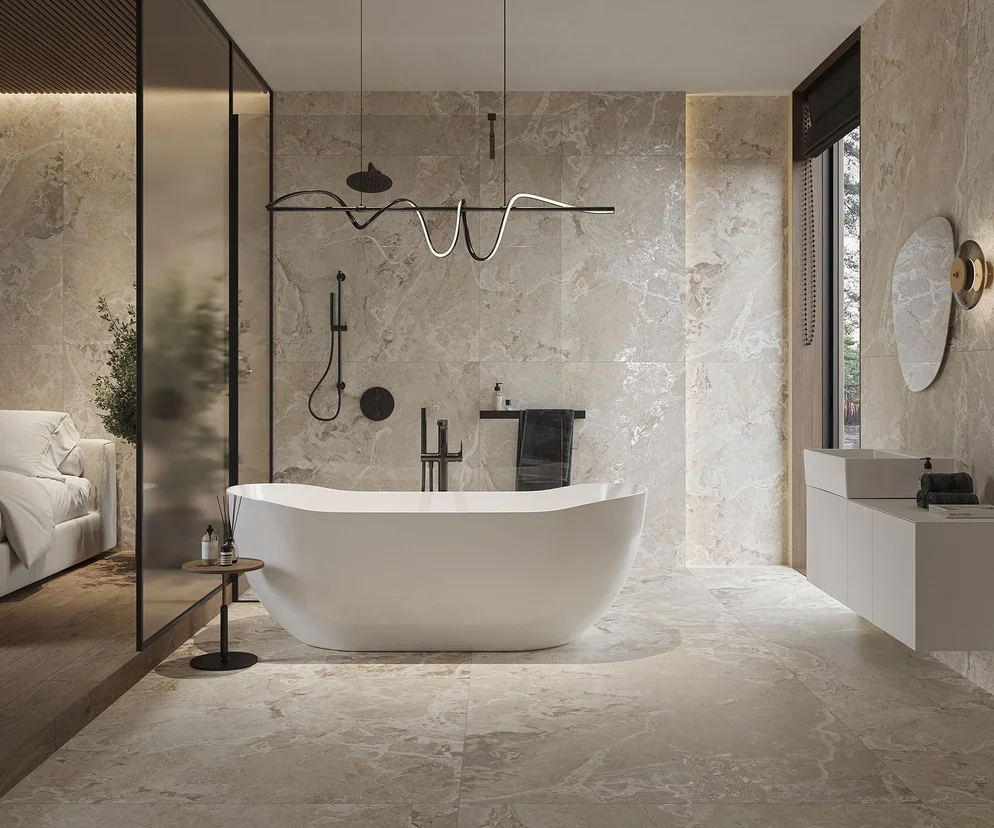 Dzięki cyfrowej aplikacji glue&granilla, rozprowadzonej niemal na całej powierzchni, płytka ARCADIA STONE zyskuje delikatny, satynowy połysk, przyjemny w dotyku i elegancki. Linie użylenia, pozostawione bez granilla, zostały podkreślone błyszczącym nadrukiem glossy ink, co tworzy wrażenie głębi i lekko rzeźbionej faktury. To kolekcja, która szczególnie bawi się ze światłem – każda zmiana jego kierunku wydobywa inny wymiar tej szlachetnej powierzchni. Jest idealna do przestrzeni, które mają emanować spokojem i klasą – od reprezentacyjnych salonów po wysmakowane łazienki czy hotele butikowe.